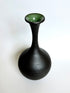 Tall wheel-thrown and hand-built warm black/brown clay bottleneck vessel with green celadon glazed mouth. A personal favorite.