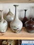 Raku fired wheel-thrown bottleneck vessel with a white glossy glaze and with beautiful crackling and fire marks around base. This is the larger of the two white bottlenecks.